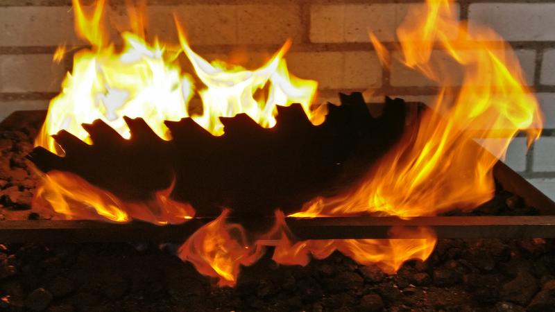The blade is made out of hardened high-carbon tool steel. It is HARD and quite brittle. Next to having to use a lot of force to forge it, there is a high chance it will break while being deformed. Before we can sensibly forge it, it must be annealed, by heating it above its curie temperature, and slowly cooling it. This removes the tamper, and makes the metal soft(er). Also, a glass bottle for some experimental slumping, because why not.